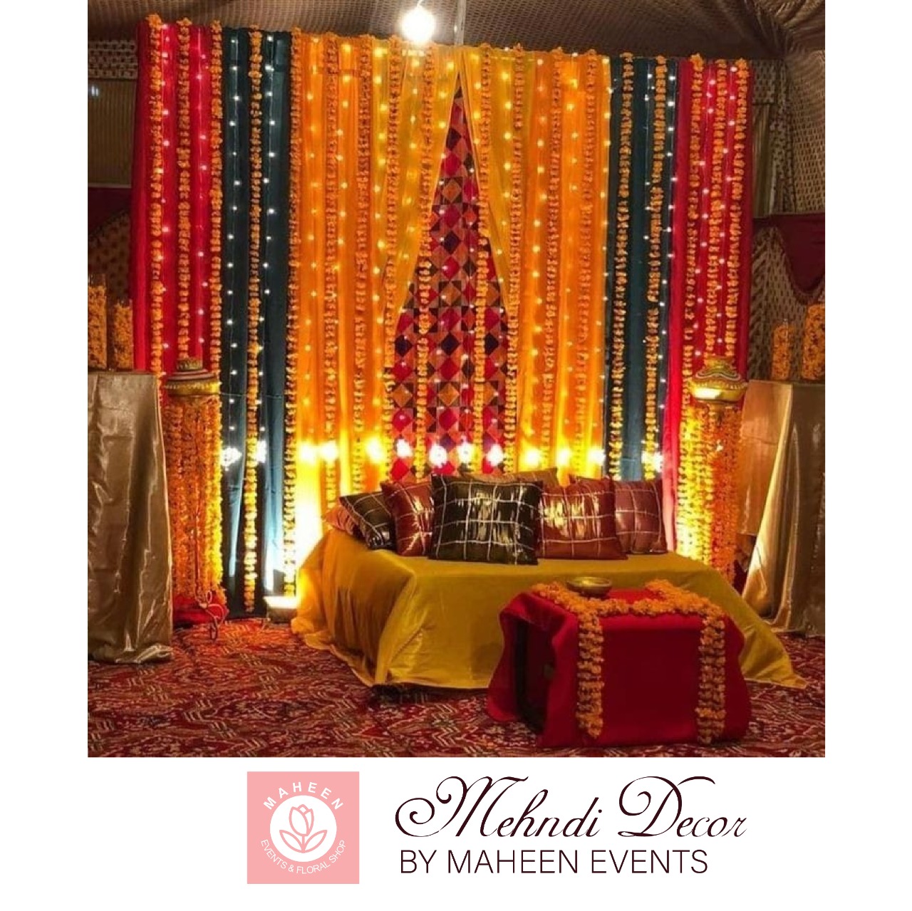 Colorful, traditional decor with dholki props, floral swings, gota work, and lights that bring Mehndi night to life.